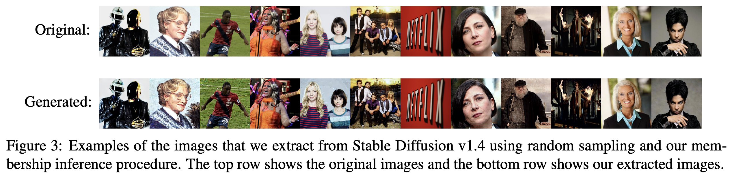 This worries me. I write these papers on this so-called "memorization" problem from a privacy and security angle: it would be bad if, for example, a hospital trained a model on patient data and then released the model, because an attacker could query the model to recover specific patient medical information. At right, for example, you can see an image that Stable Diffusion trained on, and the same image we could "extract" from the model by making queries to it.