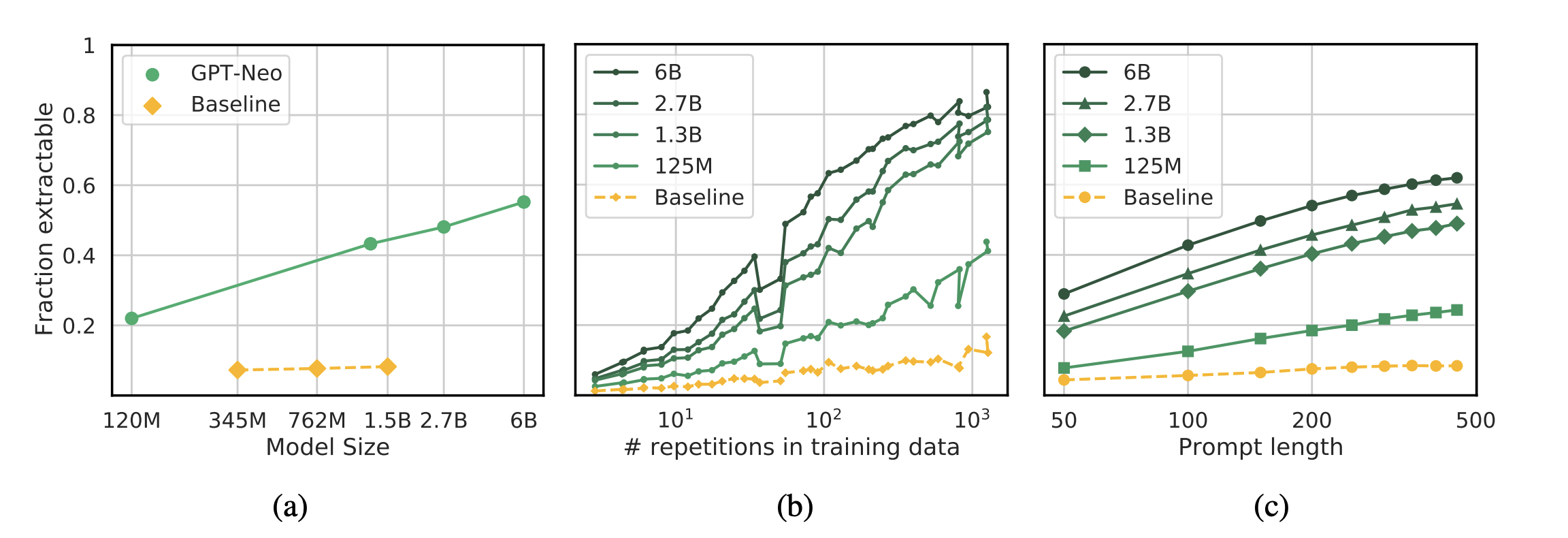 In the prior GPT-2 paper I talked about above, we speculated (and had a tiny bit of evidence) that larger models would memorize more than smaller models. Next, in this paper we quantitatively measured to what extent this is the case, and found a compelling trend where larger models memorized much more training data than smaller models. Specifically, our paper showed the following three plots: