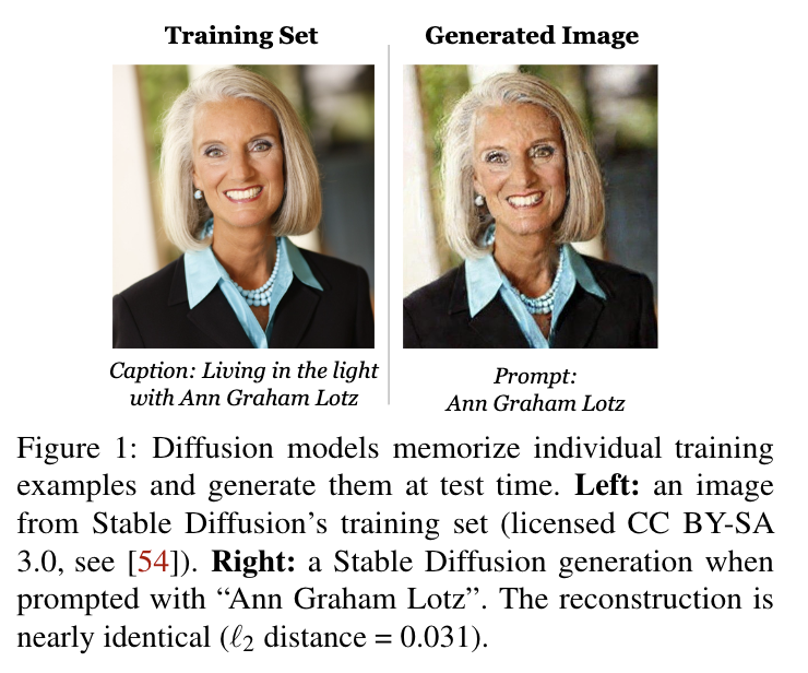 According to researcher Nicholas Carlini, “diffusion models are explicitly trained to reconstruct the training set. [source]